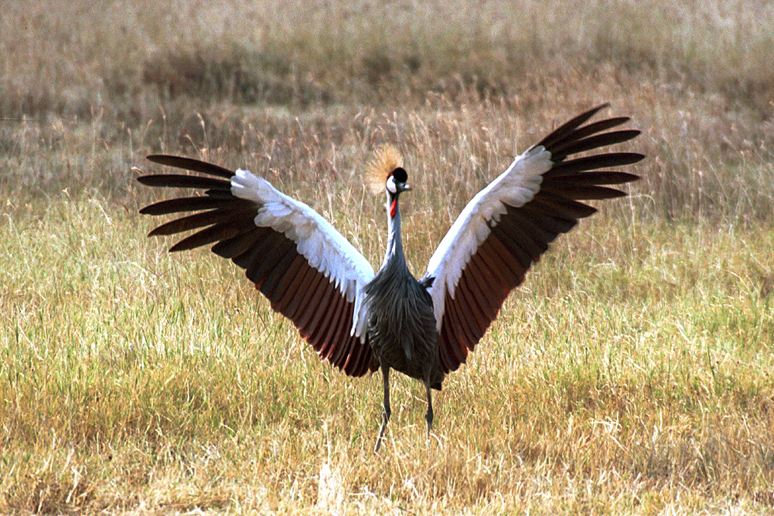 There was also a large population of grey crowned cranes in the Crater. On our first trip into the Crater in 2003, Gary Clarke and I were riding alone in a Land Rover when we came across several of the crowned cranes engaged in a mating display. The male spread his wings and jumped up and down, hoping to impress the nearby female. This display lasted for some time, but apparently was not successful since the female ultimately left the male behind. Grey Crowned Crane in Mating Dislay |