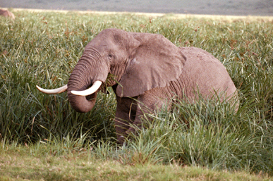 We only encountered bull elephants in the Crater and no females or young. I am unsure as to why there were only male elephants, although I am sure Gary explained it to our group on more than one occasion. I never did make a good count either of the number of the elephants in the Crater. The elephants that we saw were either alone or in pairs, although we did encounter a large group feeding in the tall grasses in a depression near one wall of the Crater and another one dusting himself. Bull Elephant Emerging from the Marsh |