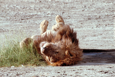 There are several prides of lions in the Crater, and I believe that we encountered most if not all of them on our first trip. On our second trip we saw very few. In 1991, off the main road and along the road to the hippo pond, we usually saw a pride laying along the side of the hill. They invariably were sleeping, especially during midday or in the evening, many times just sprawled on their back with their paws and legs in the air. This must have been their territory and they were less than a mile from our campsite. One morning after breakfast, Irene and I decided to stay in camp and sleep and not go out on the midday game drive. This was the only game drive that I missed on our entire trip. However, after the vehicles returned, I cursed my decision not to go. Those who did came back excited about the five male lions they had come across down by the lake bed. The five apparently had just killed a buffalo and eaten until they were gorged. I was quite envious and wished I had joined them. |