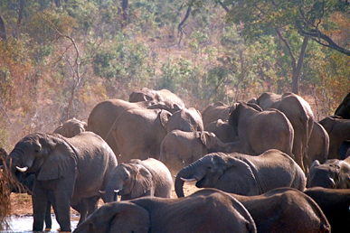 Elephant Herd The other animal we saw in great number at the waterhole was the elephant. They came to drink in small herds and large, and they came in all sizes and ages. They would drink, bathe and wallow in the mud, as well as cover themselves with dust. Whenever they approached, the other animals at the waterhole, if any, would scatter. Watching these massive animals interact was quite interesting. There were males among many of the herds that we saw in Zimbabwe. I recall being told on our safari to Tanzania that elephant herds were matriarchal, and that mature males were driven from the herd and only allowed back in during mating season. This did not seem to be the case with the herds in Hwange. Many adult males were interspersed throughout the herds. I remember one male, obviously very excited, chasing an unwilling female. She screamed and ran in circles, the male screaming and in hot pursuit. They soon disappeared into the trees behind the waterhole, and we never did find out if he was successful in his endeavors. |