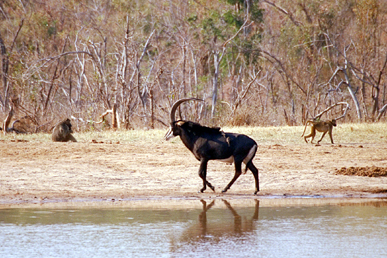 Male Sable The kudu were magnificent animals also. The males have distinctive long spiraling horns, which may be as impressive a set of horns as I have ever seen. The kudu were similar to the sable antelope in that I do not recall adult males traveling with a herd. Rather, the herd usually consisted of females and young, and the adult males were usually seen alone or in small gatherings of other adult male kudu. |