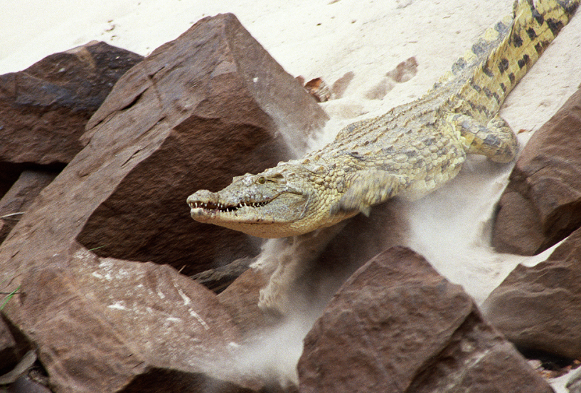The Rufiji River purportedly has the largest concentration of crocodiles in Africa. These crocodiles, a curious color of yellowish-green, could be seen everywhere on the River. Even at night, red eyes could be seen lit up by my torch. On our boat excursions, numerous crocodiles were sighted on the banks. At one location, two crocodiles lay on the rocks some 20 feet above the River. As we approached, they suddenly leapt forward and scurried into the safety of the waters, leaving a trail of dust behind. I did not realize crocodiles could move that quickly on land